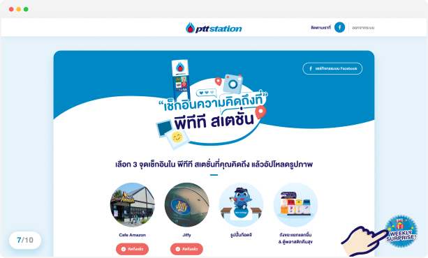 ผู้เข้าร่วมกิจกรรมที่มีสิทธิ์เล่นกิจกรรม Weekly Surprise ได้นั้นต้องทำภารกิจของกิจกรรมหลัก “เช็กอิน ความคิดถึงที่ PTT Station” ครบทั้ง 3 จุดเรียบร้อยและทำตามกติกาอย่างครบถ้วนแล้วเท่านั้น