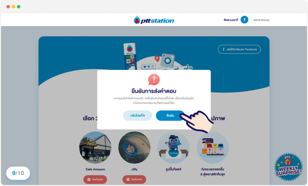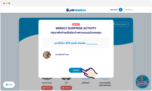 ปุ่ม Weekly Surprise จะอยู่ที่มุมซ้ายล่างของเว็บไซต์ เมื่อคลิกที่ปุ่มจะพบกับคำถามพิเศษประจำสัปดาห์ โดยตอบคำถามในกล่องข้อความ แล้วคลิก “ส่งคำตอบ”